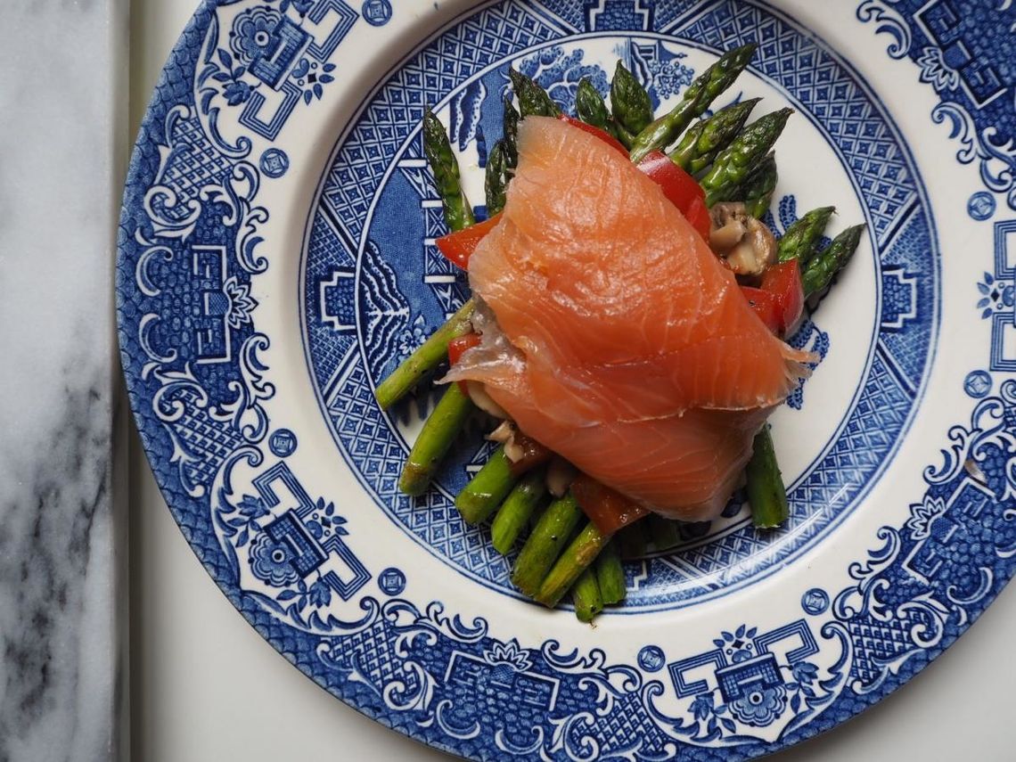 The perfect protein stack ideal for breakfast, lunch or dinner. A delicious combination of asparagus, smoked salmon, peppers, mushrooms and a runny poached egg.