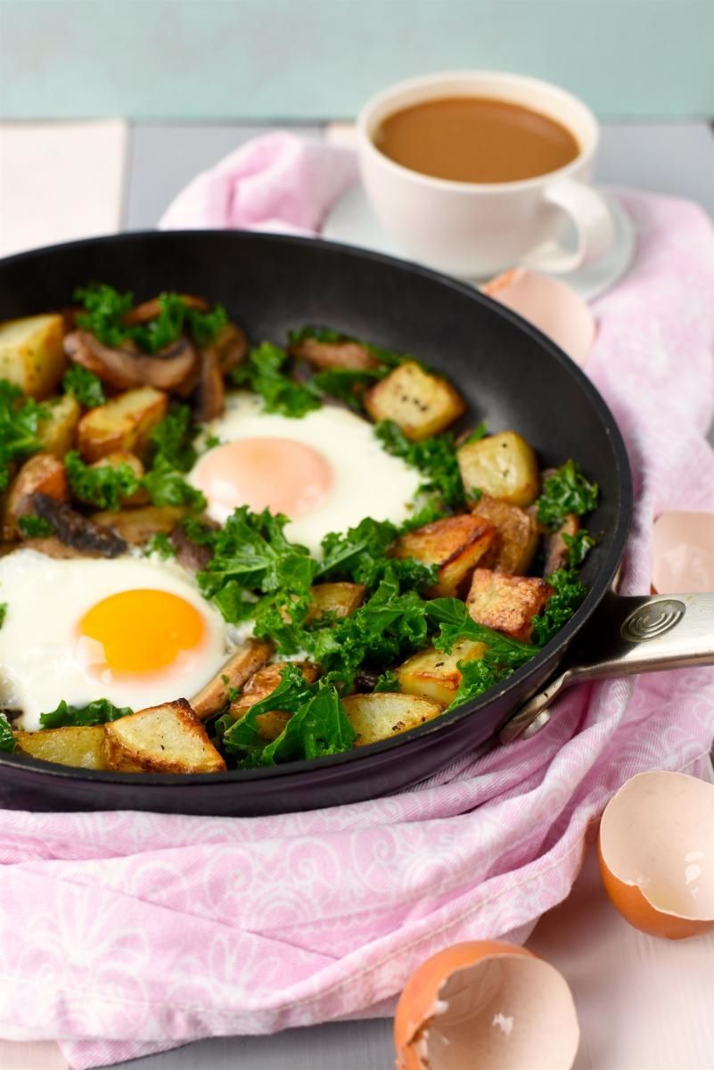 The runny yolks from the eggs provide the perfect sauce for these crispy potatoes and adding the mushrooms and kale is a great way to get a head start on your 5-a-day.