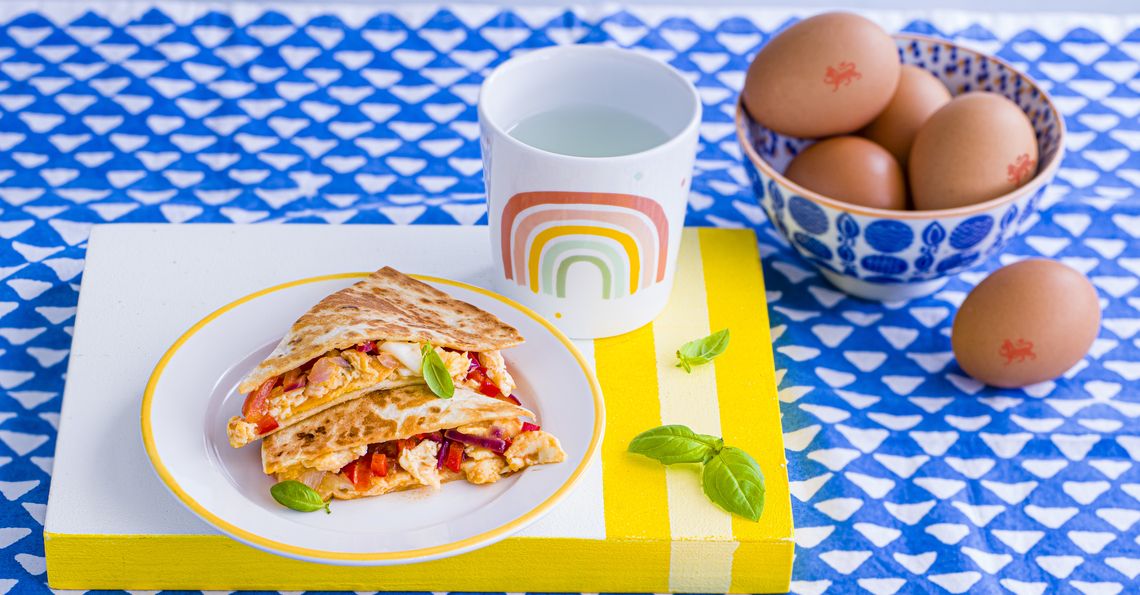 - Put one wrap onto a board. Top with the scrambled eggs and diced vegetables and sprinkle with cheese. Top with the second wrap and press down.