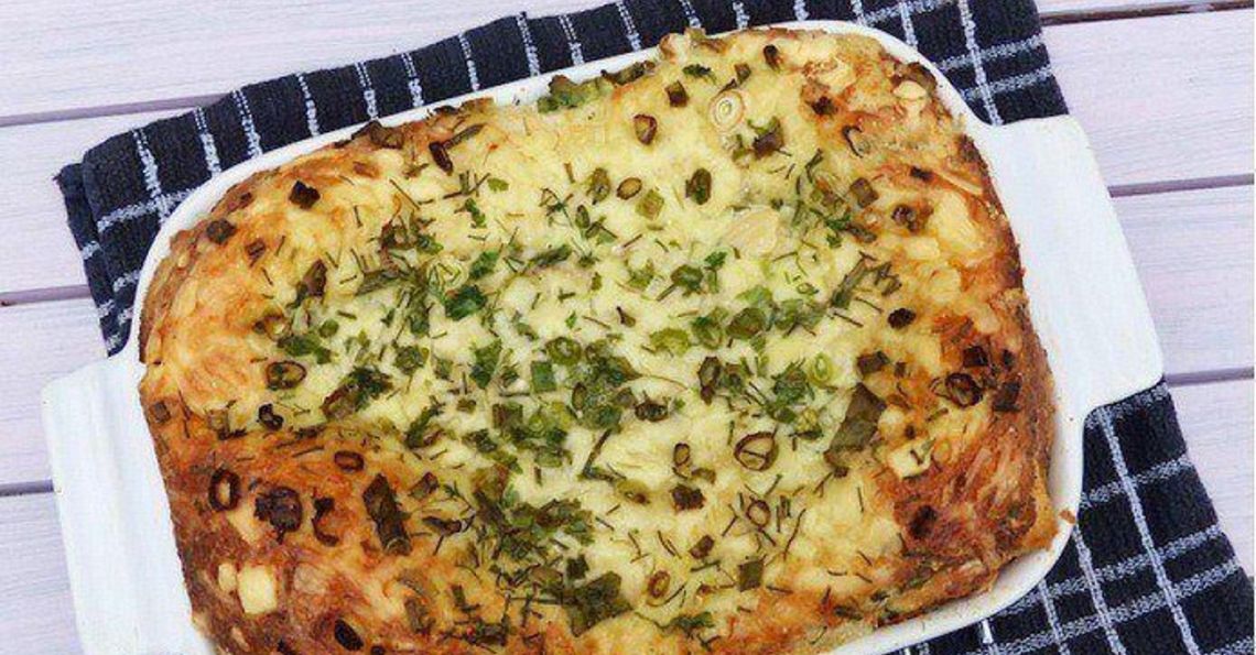 - Place a final layer of bread and pour over the remaining egg mixture, pressing the bread down so that the liquid is soaked up. Sprinkle the remaining herbs and cheese over the top and cover with foil.