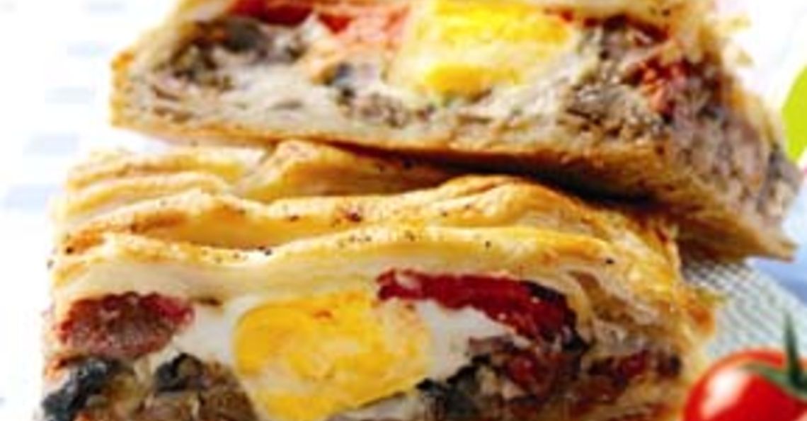 - Finely chop the remaining steak and place around the eggs. Top with remaining chicken and press down firmly. Pour in the stock over the chicken. Roll out the remaining pastry into a round to form the lid. Brush the edges of the pastry, top and lid, with beaten egg. Place lid on top of pie and seal the edges well. Trim off any excess pastry and flute the top edge. Make a small hole in the centre of the pastry and place a clean paper straw or small roll of greaseproof paper into the hole to allow the steam to escape. Roll out the pastry trimmings to make leaves and attach to the pie with beaten egg.
