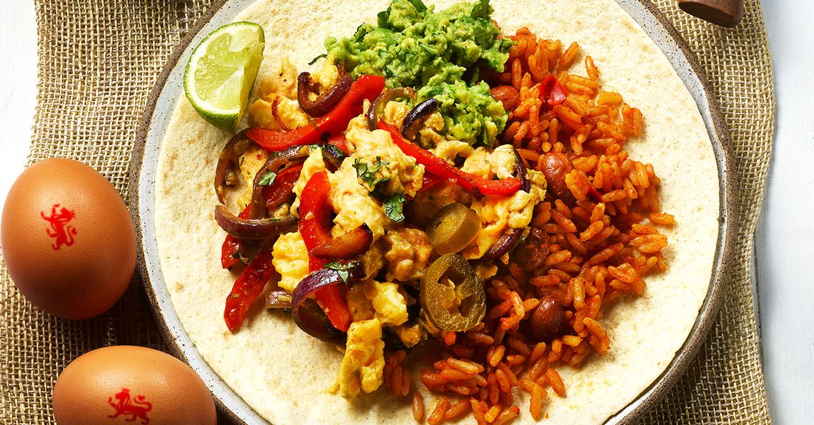 - To serve spoon a little hot rice over the warm tortillas top with the egg mixture, a dollop of avocado and a squeeze of lime - fold up and cut in half to serve. Serve with soured cream and pickled jalapeños if liked.