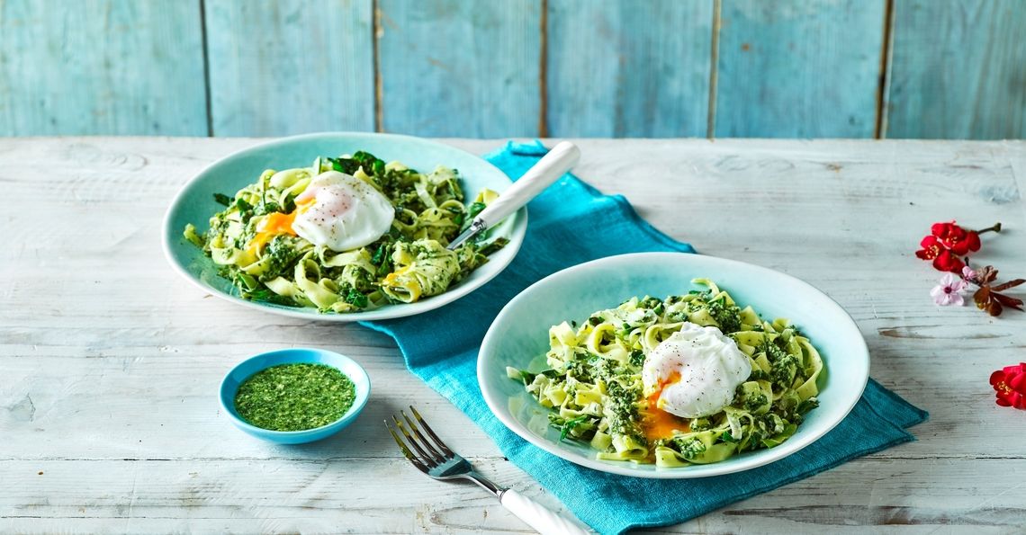 5. Season the pasta to taste, toss the basil through and divide between four serving bowls. Top each bowl with a poached egg and drizzle each with a little of the reserved pesto. Serve immediately.
