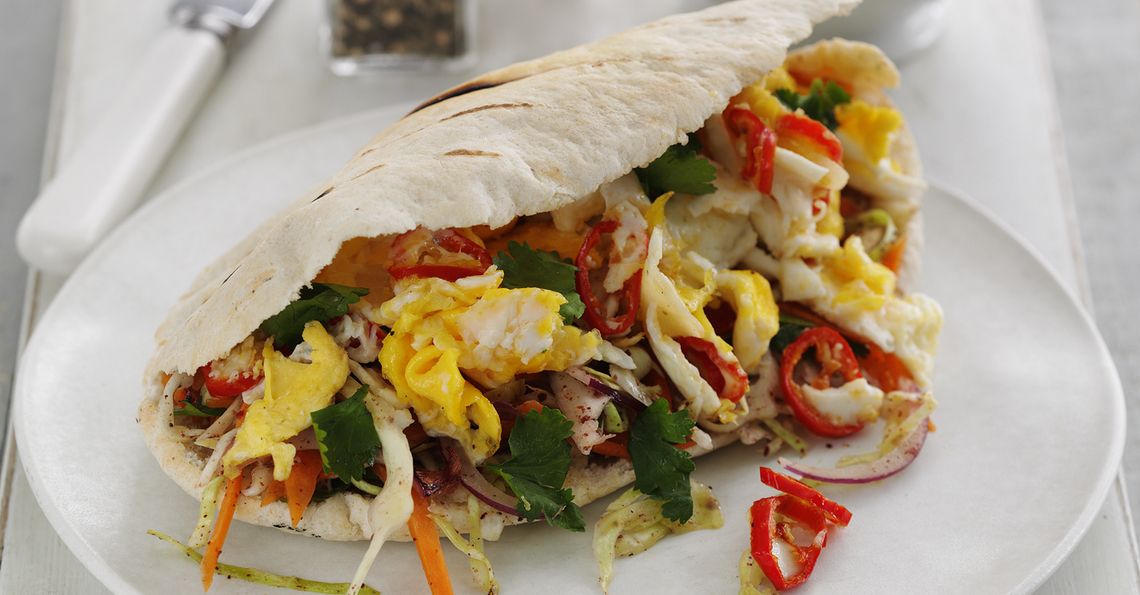 3. Toast the pitta and split open. Stuff with the slaw and eggs, and scatter with coriander.
