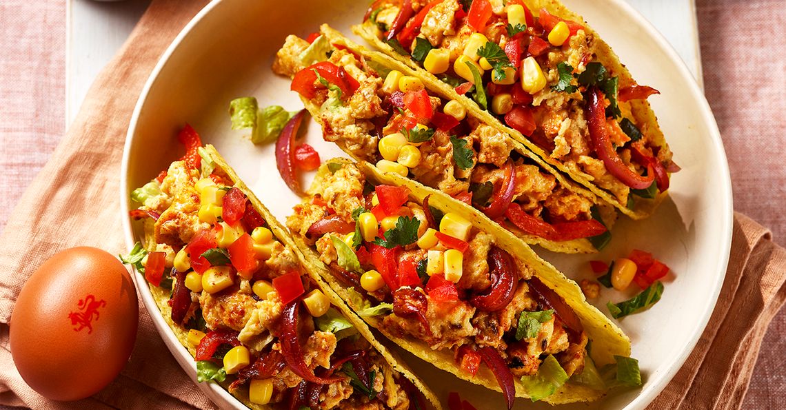 6. Fill each of the taco shells with a little lettuce, top with the egg mixture, then top with the sweetcorn salsa. Serve straight away with hot sauce for those who want to spice it up! Can be served hot, or warm - eat the tacos within 30 mins of filling